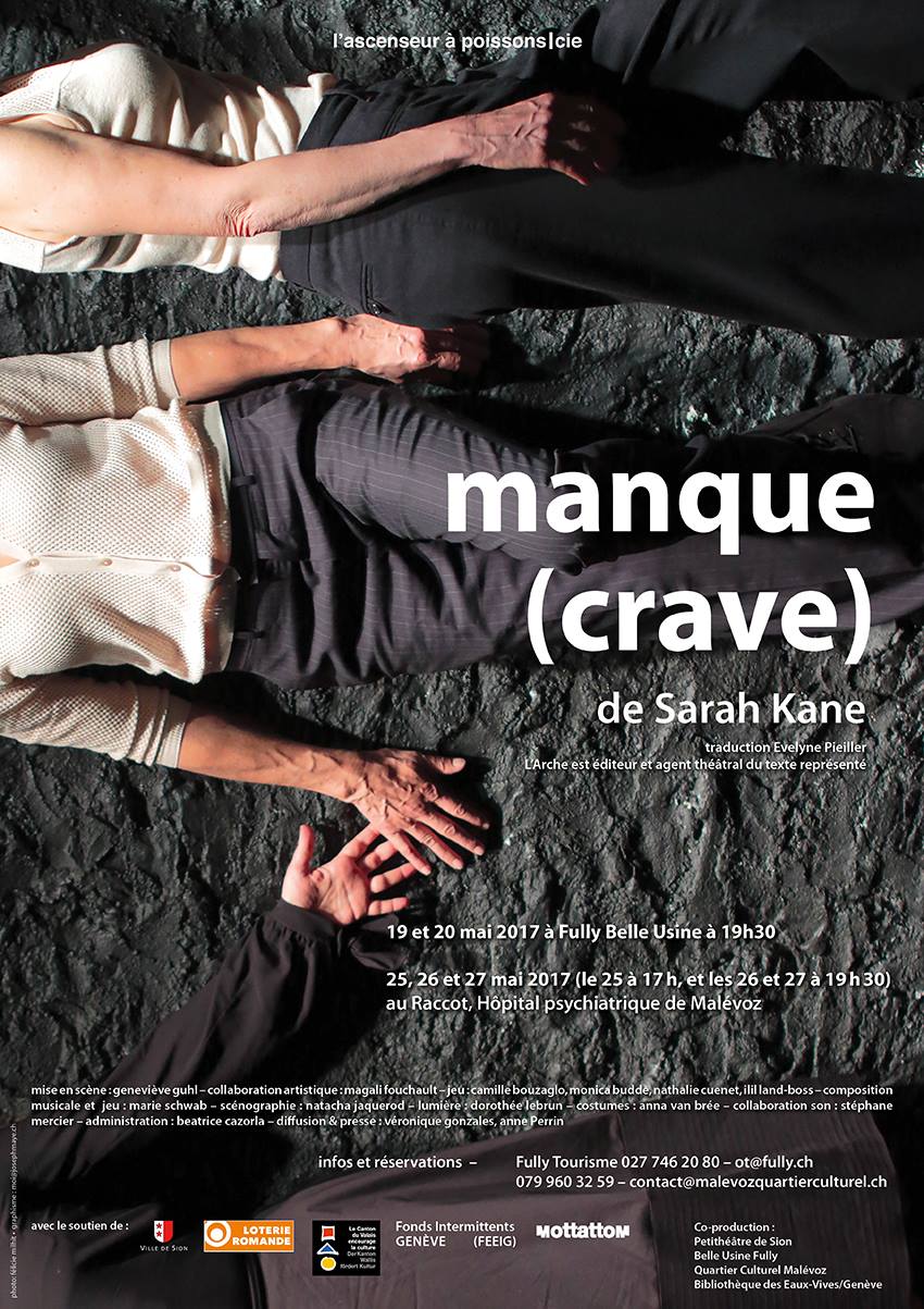 2017 – 2019(Sarah Kane), dir.: Geneviève Guhl / ascenseur à poissons ciePetithéâtre Sion, Belle Usine Fully, Quartier Culturel Hôpital Psychiatrique de Malévoz Monthey, Grange de Dorigny Lausanne, Théâtre du Galpon Genève